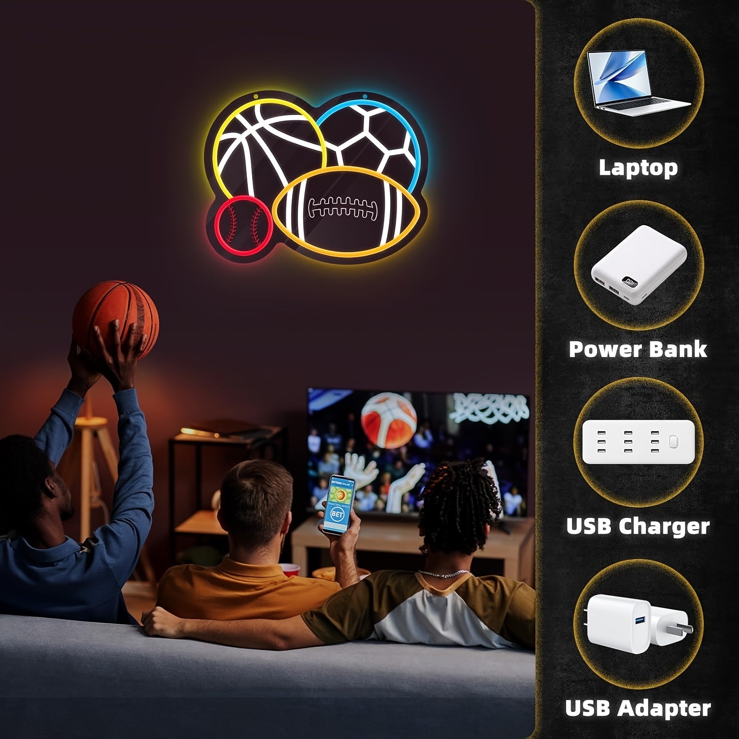 - Displays four neon-style ball icons—representing popular sports—to create an eye-catching focal point in game rooms, studios, or bedrooms.