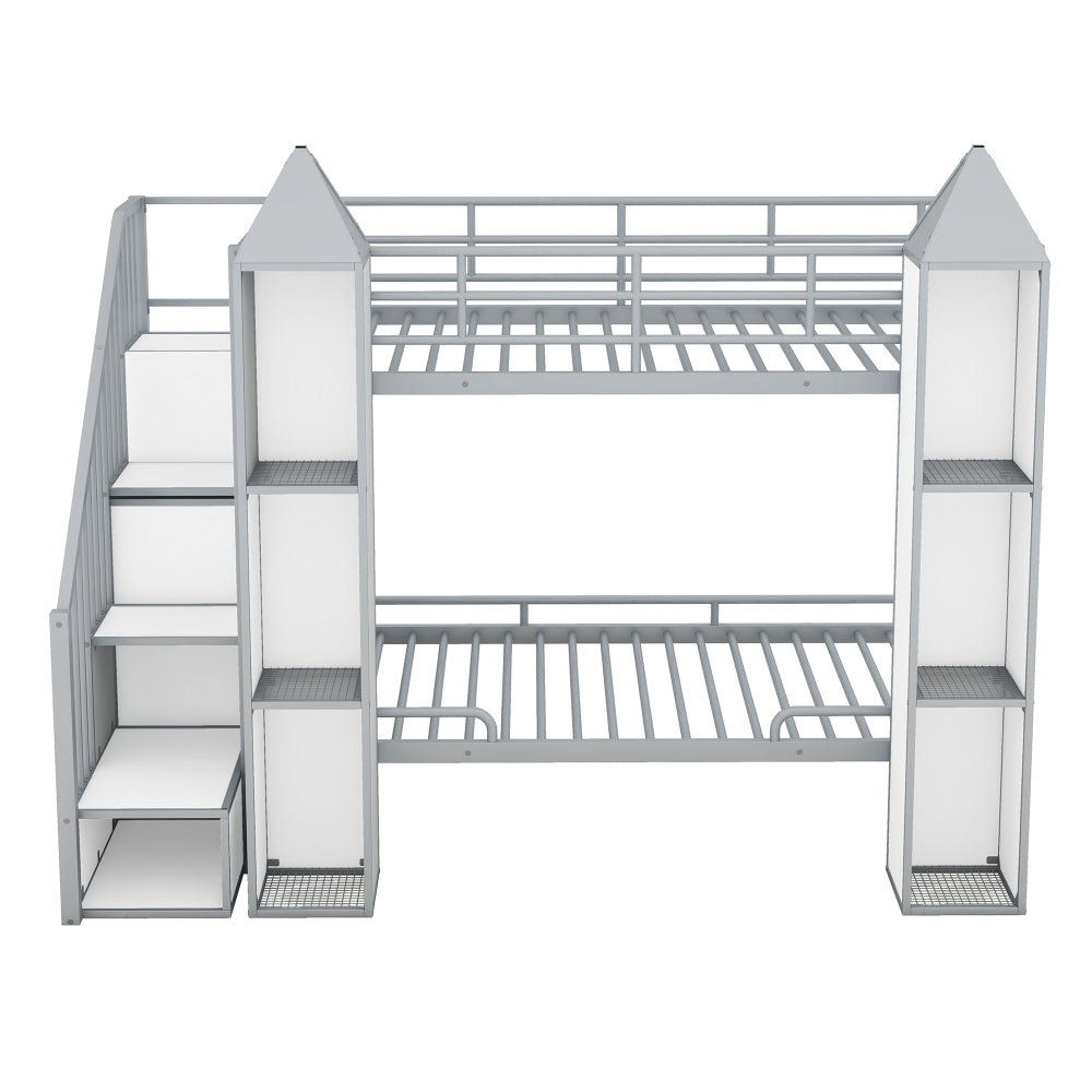 - Castle-inspired design with safety in mind: guardrails, a sturdy slanted staircase, and a durable metal frame.