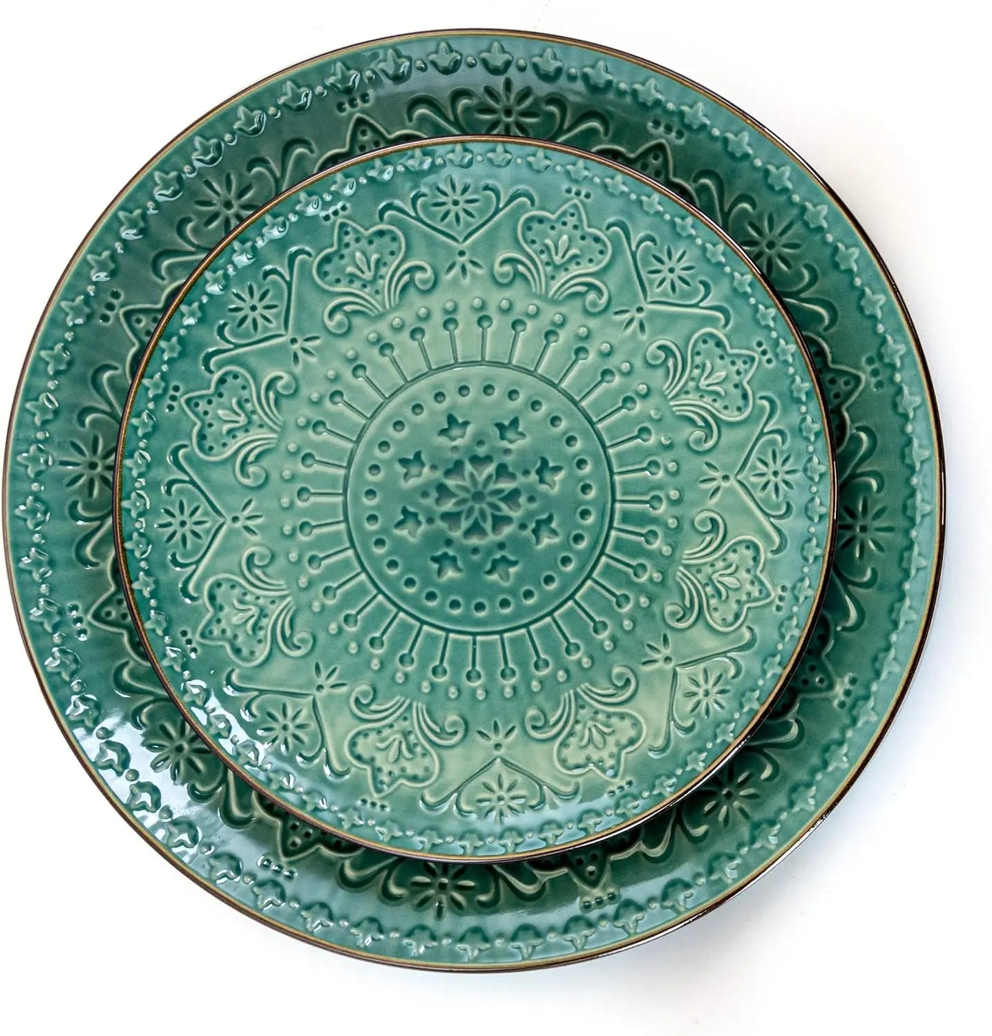 - Mandala-inspired shapes and seafoam glaze in ocean blues and teal greens add a unique, contemporary look to your table, elevating seafood nights, salads, and everyday meals.