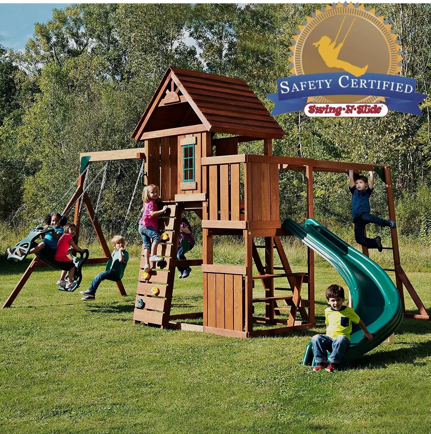 - All-in-one playset includes two swings, a Sidewinder slide, monkey bars, a glider, a picnic table, and a rock-wall climb with 8 holds under a decorative wood roof.