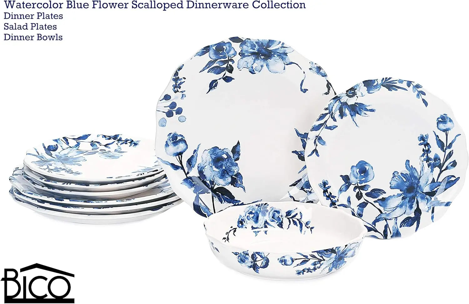 - 11-inch plates feature a watercolor floral motif with blue accents and scalloped edges, finished glossy and smooth to frame your dishes beautifully for daily meals or special occasions.